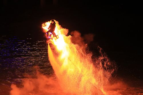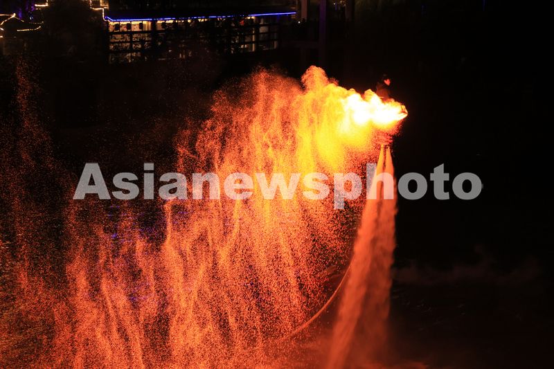 2024年12月19日,浙江省金华市武义县履坦镇叶长埠村武义江上,水上火壶表演震撼上演。表演者身着防火服,脚踩水上飞行器,手举火壶,将炽热木炭摇出漫天星火,为市民游客带来一场“水火共舞”的视觉盛宴。