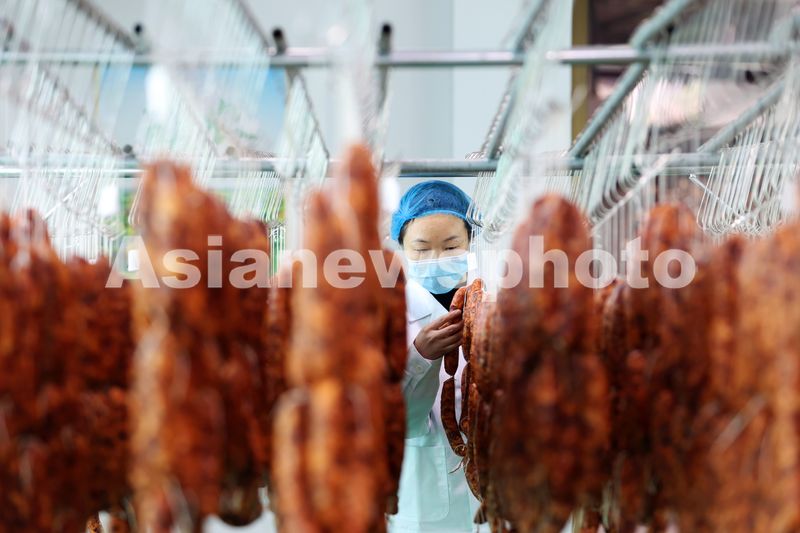 2024年12月22日,重庆市黔江区一食品加工公司工人在生产车间查看腊香肠的晾晒情况。