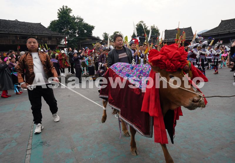 图片说明:12月22日,在广西融水苗族自治县梦呜苗寨,苗族同胞牵着黄牛举行“打同年”仪式。
