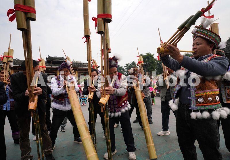 图片说明:12月22日,在广西融水苗族自治县梦呜苗寨,“同年”们吹奏芦笙。