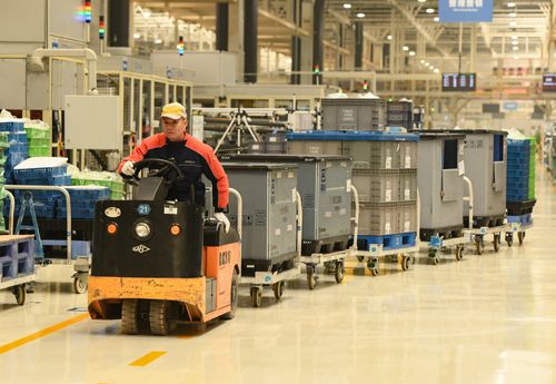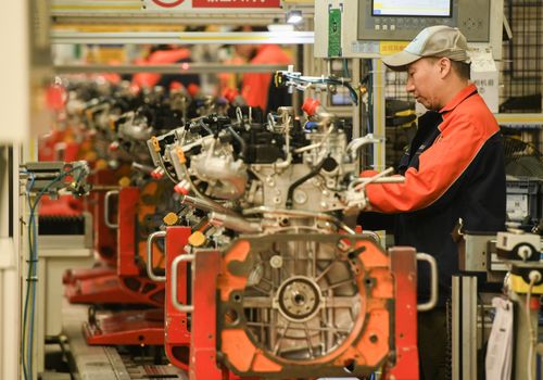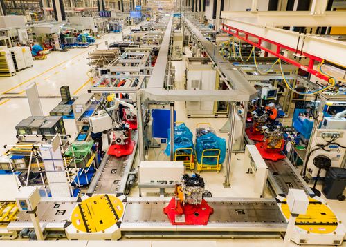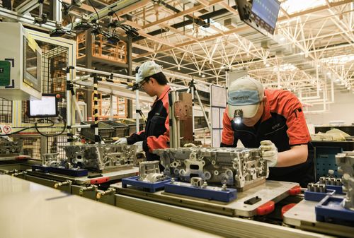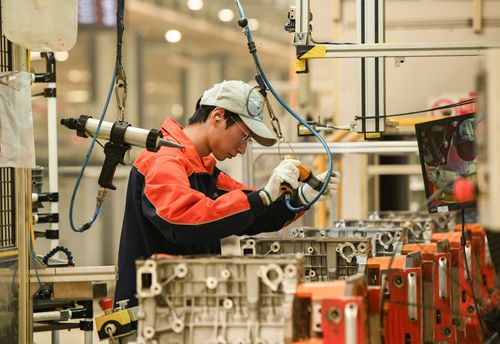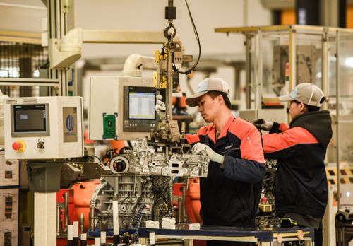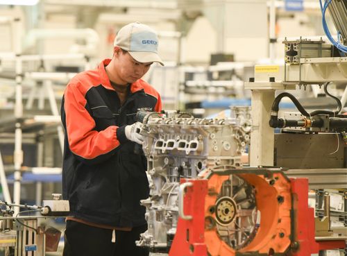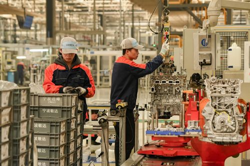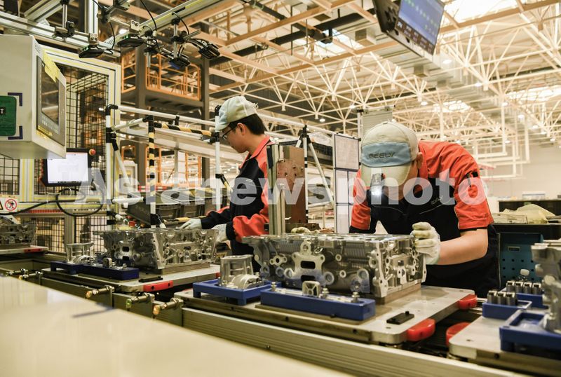 图片说明:2024年12月26日,浙江省义乌吉利动力总成发动机制造工厂,技术工人在智能化生产车间装配油电混动汽车发动机。