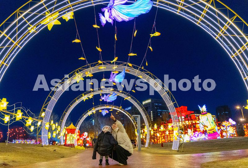 图片说明:2024年12月25日,人们在呼和浩特市赛罕区小草公园灯会上赏灯。