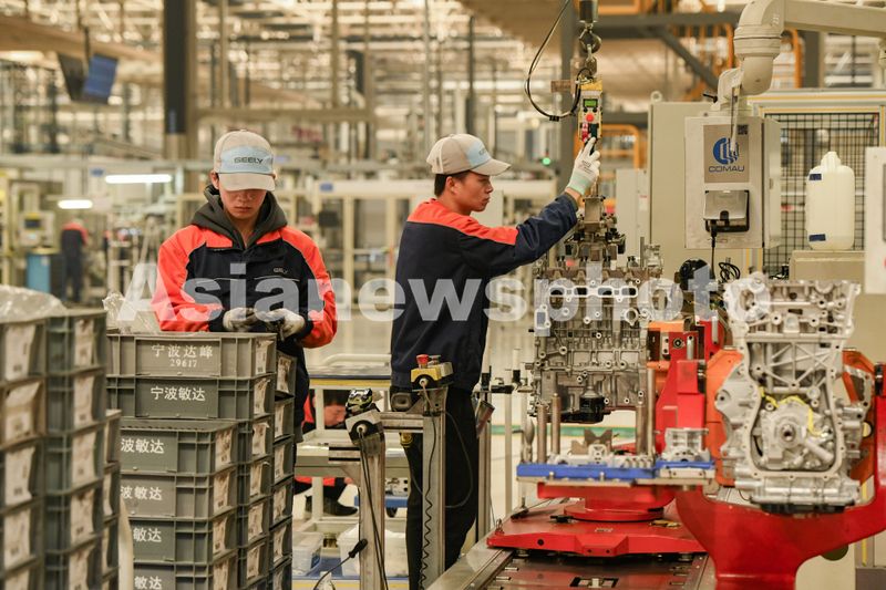 图片说明:2024年12月26日,浙江省义乌吉利动力总成发动机制造工厂,技术工人在智能化生产车间装配油电混动汽车发动机。