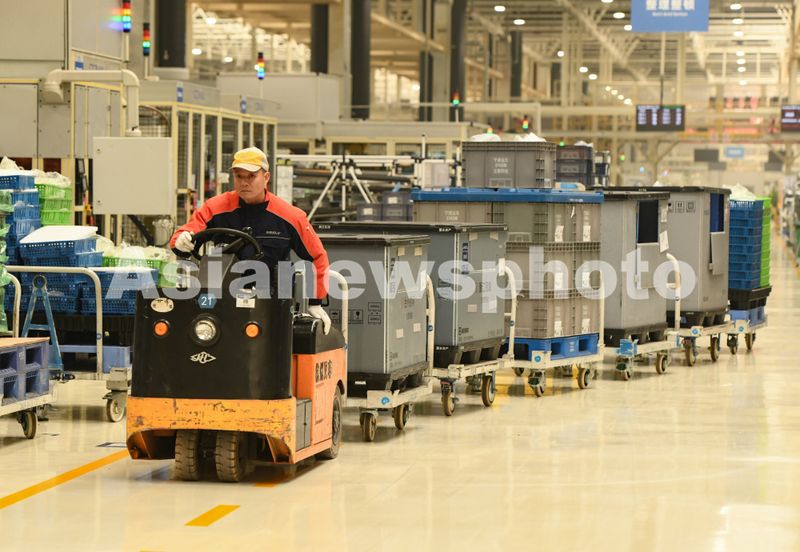 图片说明:2024年12月26日,浙江省义乌吉利动力总成发动机制造工厂智能化生产车间,工人用物流车运输物料。