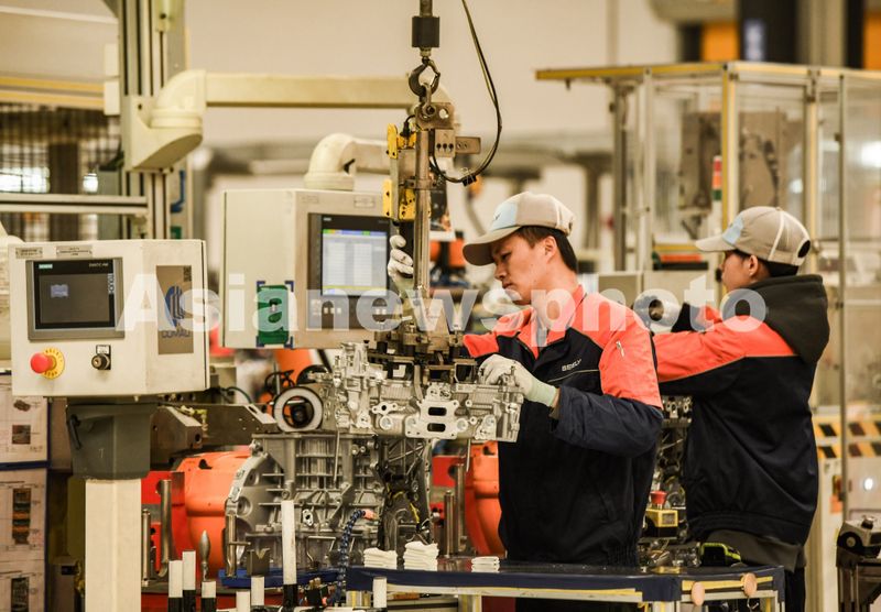 图片说明:2024年12月26日,浙江省义乌吉利动力总成发动机制造工厂,技术工人在智能化生产车间装配油电混动汽车发动机。