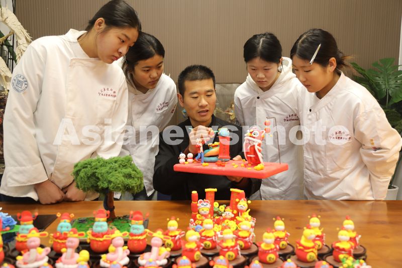 12月27日,在临沂市技师学院,沂蒙面塑传承人韩红元带领学生制作面塑蛇作品。