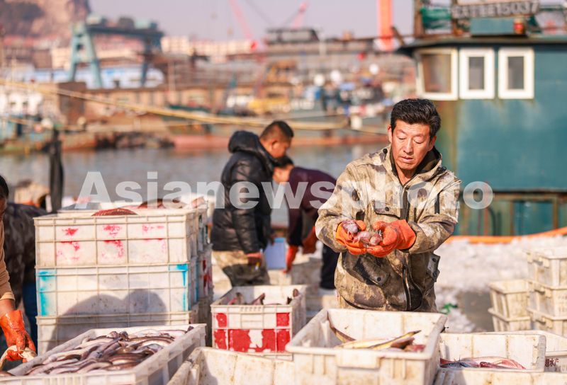 图片说明:2024年12月30日,在山东省荣成市石岛渔港码头一派繁忙景象,渔民们忙碌着卸下渔获,分拣整理海鲜,通过冷链物流发往各地,供应即将到来的年货市场。