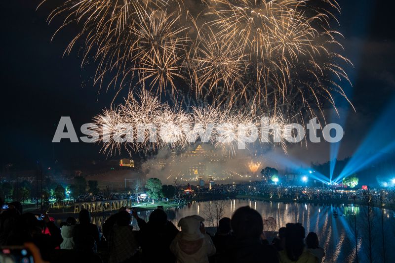 图片说明:2024年12月31日晚,浙江省金华市武义县花田美地景区里,四方游客在欣赏美丽的跨年烟花秀,喜庆迎新年。