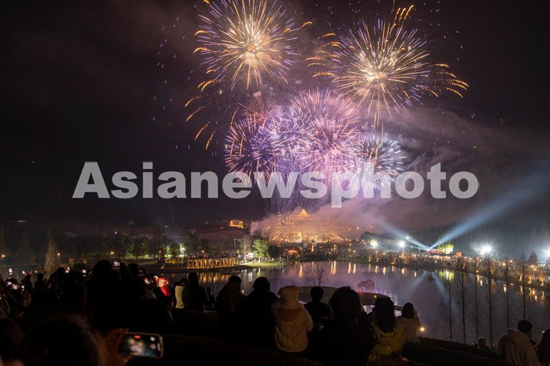图片说明:2024年12月31日晚,浙江省金华市武义县花田美地景区里,四方游客在欣赏美丽的跨年烟花秀,喜庆迎新年。