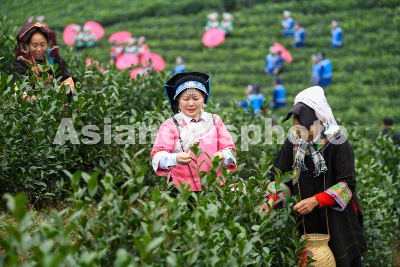 2025年1月1日,全国早茶大会暨2025年“贵州绿茶”第一采活动在贵州省黔西南布依族苗族自治州普安县茶源街道举行。活动现场,身穿民族服饰的群众在碧绿的茶园中采茶、民俗文化展示等,欢庆新年第一采。