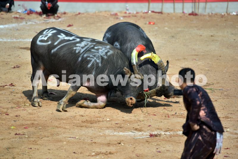 图片说明:12月28日,两头斗牛在贵州省从江县下江镇弄刷斗牛塘打斗。