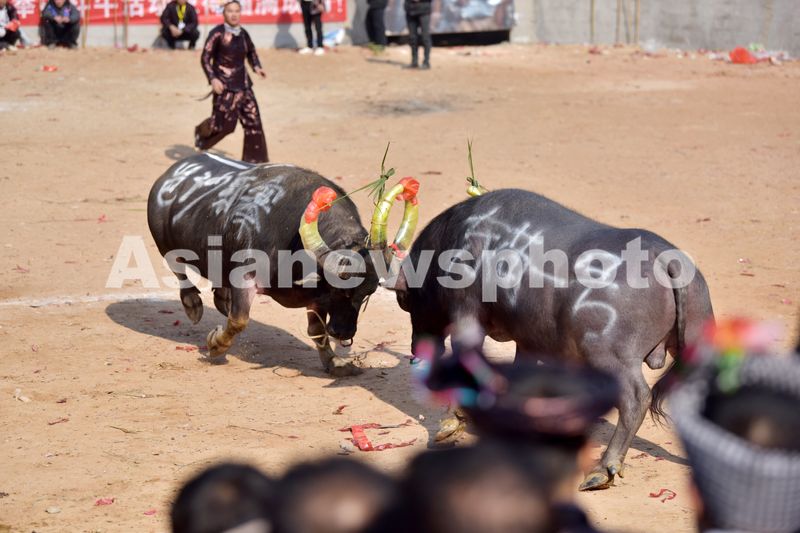 图片说明:12月28日,两头斗牛在贵州省从江县下江镇弄刷斗牛塘打斗。