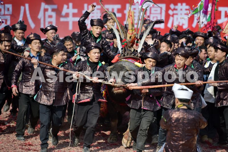 图片说明:12月28日,人们在贵州省从江县下江镇弄刷斗牛塘为获胜斗牛欢呼喝彩。