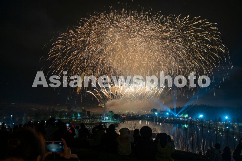图片说明:2024年12月31日晚,浙江省金华市武义县花田美地景区里,四方游客在欣赏美丽的跨年烟花秀,喜庆迎新年。