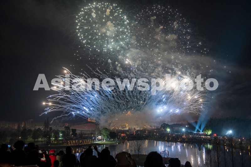图片说明:2024年12月31日晚,浙江省金华市武义县花田美地景区里,四方游客在欣赏美丽的跨年烟花秀,喜庆迎新年。