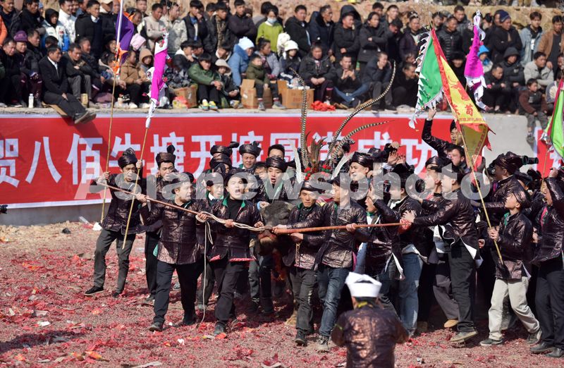 图片说明:12月28日,人们在贵州省从江县下江镇弄刷斗牛塘为获胜斗牛欢呼喝彩。