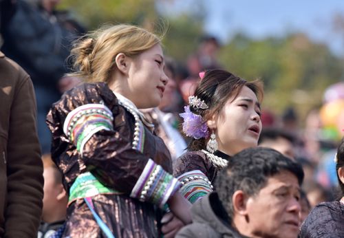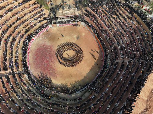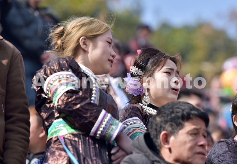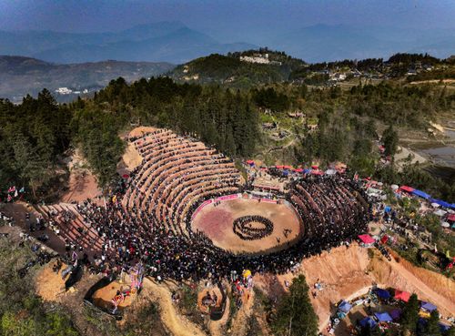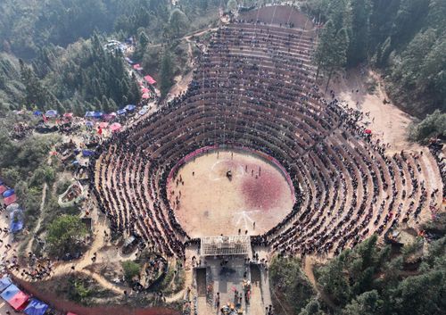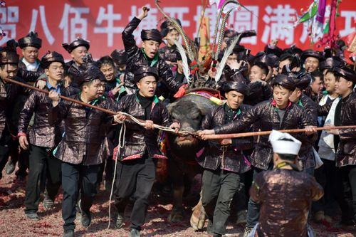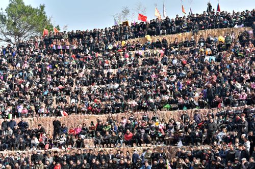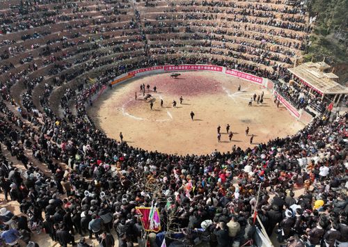 图片说明:12月28日,人们在贵州省从江县下江镇弄刷斗牛塘观看斗牛活动。