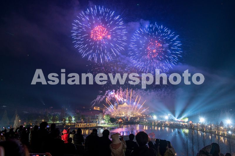 图片说明:2024年12月31日晚,浙江省金华市武义县花田美地景区里,四方游客在欣赏美丽的跨年烟花秀,喜庆迎新年。