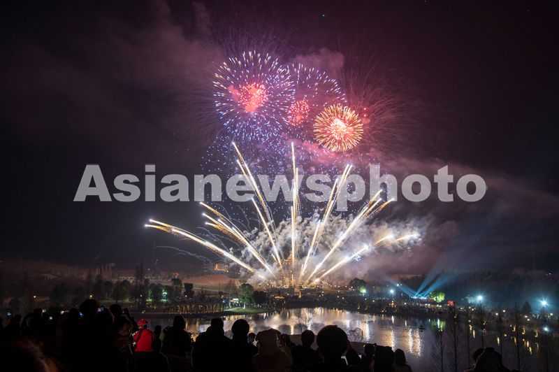 图片说明:2024年12月31日晚,浙江省金华市武义县花田美地景区里,四方游客在欣赏美丽的跨年烟花秀,喜庆迎新年。