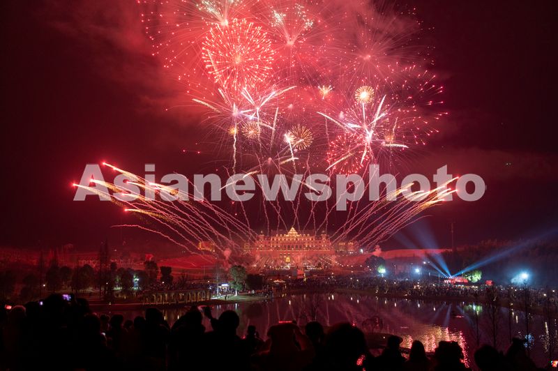 图片说明:2024年12月31日晚,浙江省金华市武义县花田美地景区里,四方游客在欣赏美丽的跨年烟花秀,喜庆迎新年。