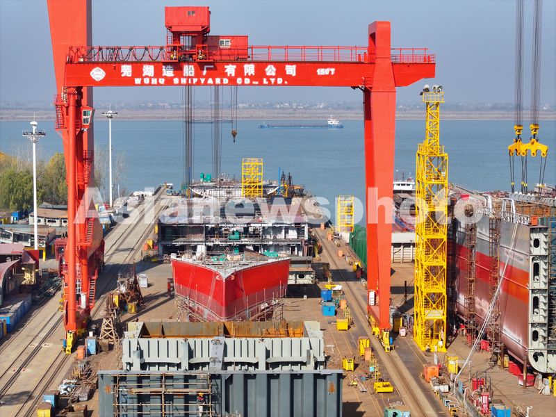 2025年1月1日,安徽省芜湖市三山经济开发区芜湖造船厂,工人们坚守岗位正在赶制出口船舶订单。