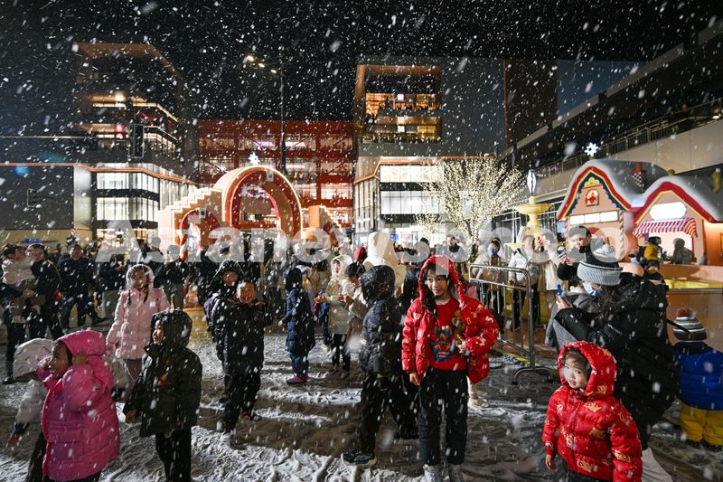 图片说明:2024年12月31日,市民在江苏省南京市雨花万象天地的“雪”景中欢度跨年夜。