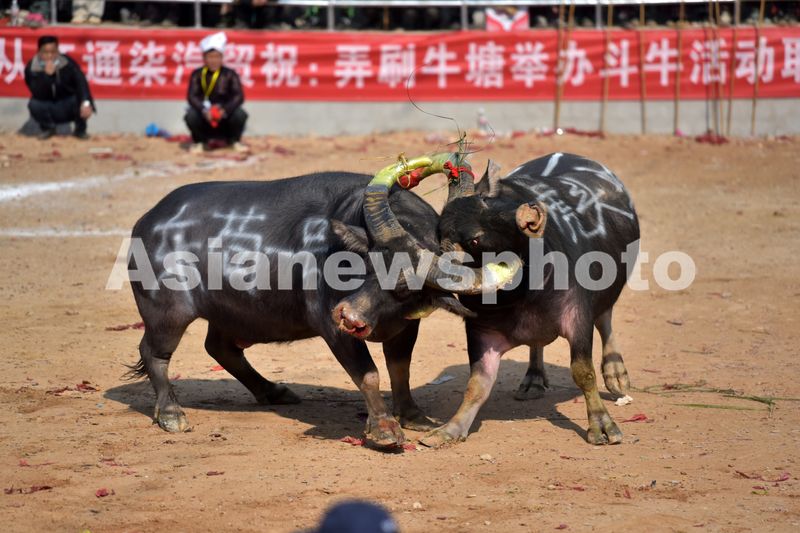 图片说明:12月28日,两头斗牛在贵州省从江县下江镇弄刷斗牛塘打斗。