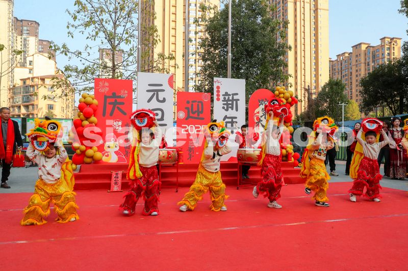图片说明:2024年12月31日,湖南省永州市新田县叠翠幼儿园,小朋友在表演舞狮。