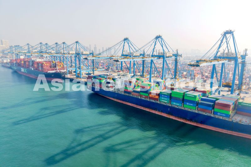 2025年1月1日,山东港口青岛港全自动化码头,货轮在装卸集装箱。