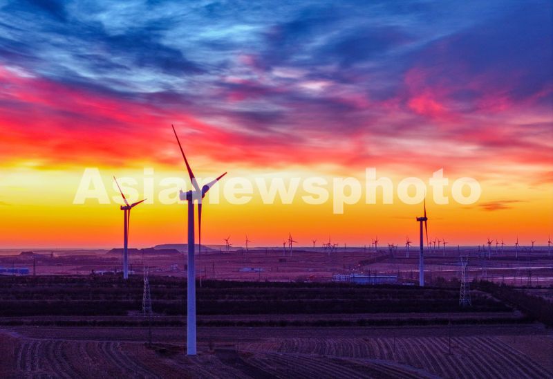 内蒙古兴安盟:新年日出辉映风电场 查看组图