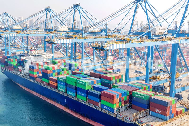 2025年1月1日,山东港口青岛港全自动化码头,货轮在装卸集装箱。