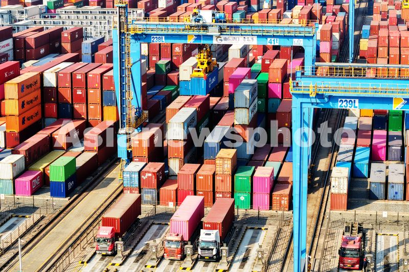 2025年1月1日,山东港口青岛港全自动化码头,货车在装载运输外贸集装箱。