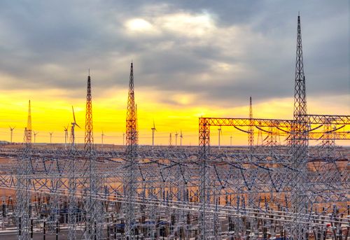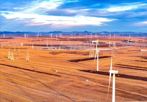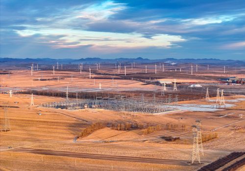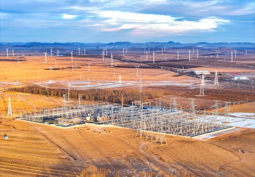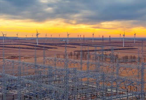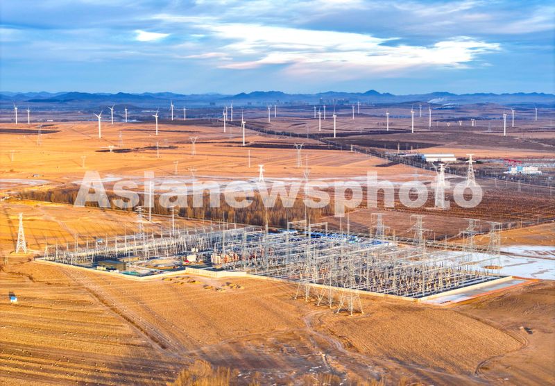 图片说明:2025年1月1日,内蒙古兴安盟一处500千伏风电变电站新年日出时刻景象(无人机照片)。
