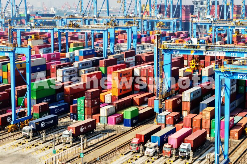 2025年1月1日,山东港口青岛港全自动化码头,货车在装载运输外贸集装箱。