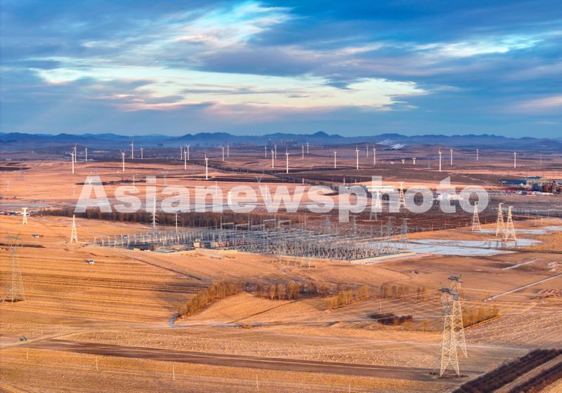 图片说明:2025年1月1日,内蒙古兴安盟一处500千伏风电变电站新年日出时刻景象(无人机照片)。