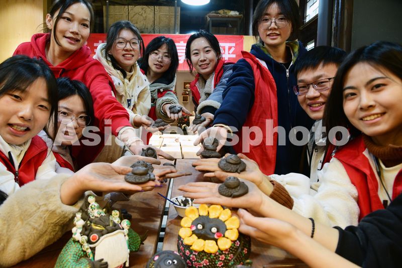 图片说明:2025年1月3日,在江苏省镇江市“太平泥叫叫”体验馆,江苏大学的学生在展示他们制作的泥叫叫“生肖蛇”。