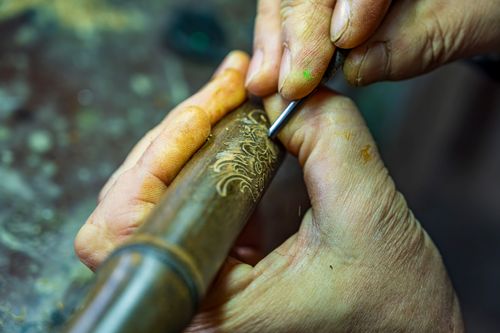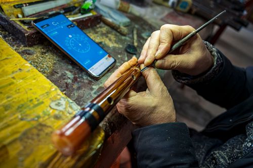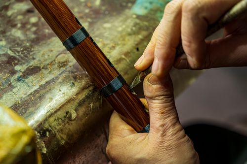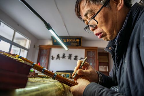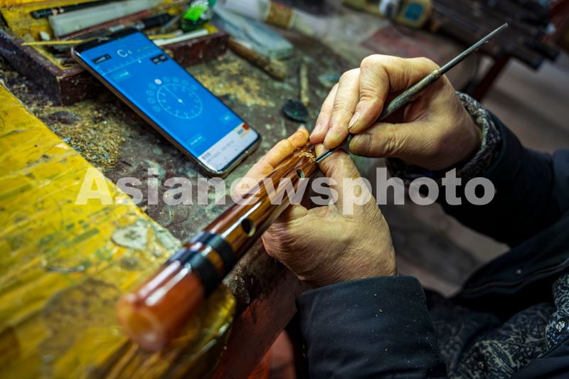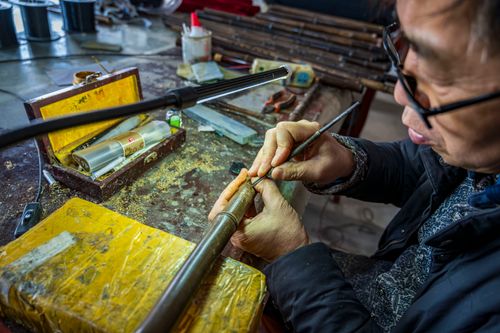 图片说明:2025年1月2日,贵州省铜仁市玉屏侗族自治县,玉屏箫笛制作技艺传承人吴继红师傅在制作的笛子上雕刻花纹。