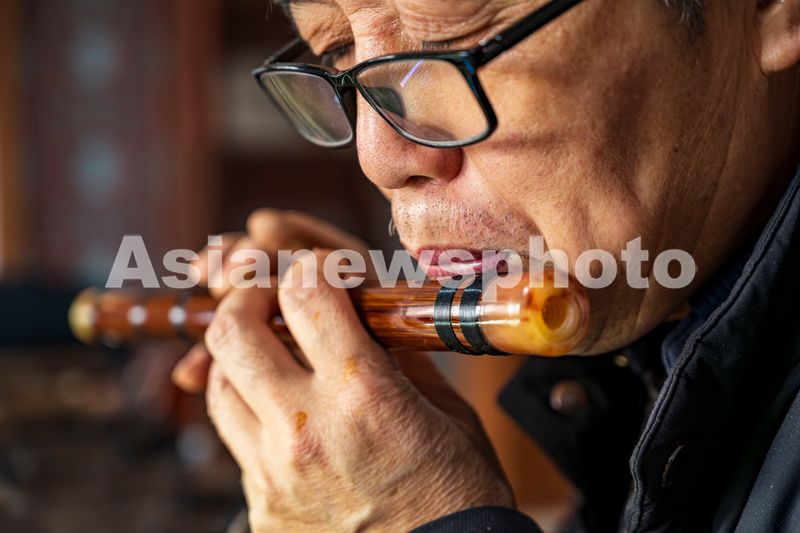 图片说明:2025年1月2日,贵州省铜仁市玉屏侗族自治县,玉屏箫笛制作技艺传承人吴继红师傅在对制作的一支笛子进行试音。