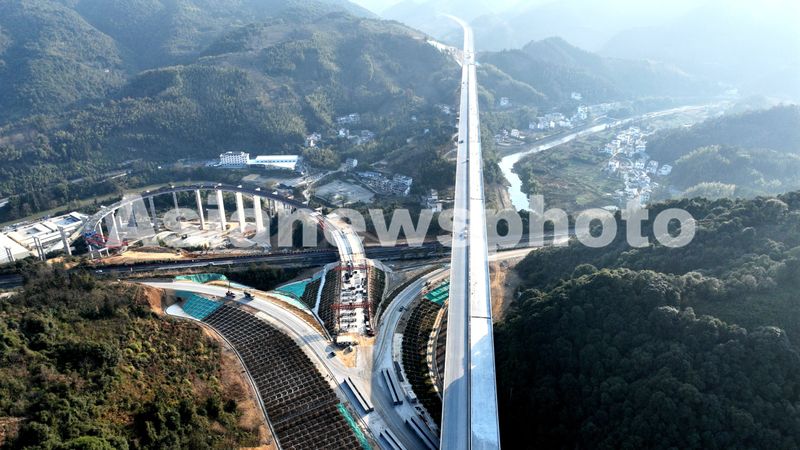 2025年1月2日,江西省十四五重点工程遂川至大余高速公路(简称遂大高速)崇义枢纽互通施工现场,工人正在加班加点架箱梁施工作业。