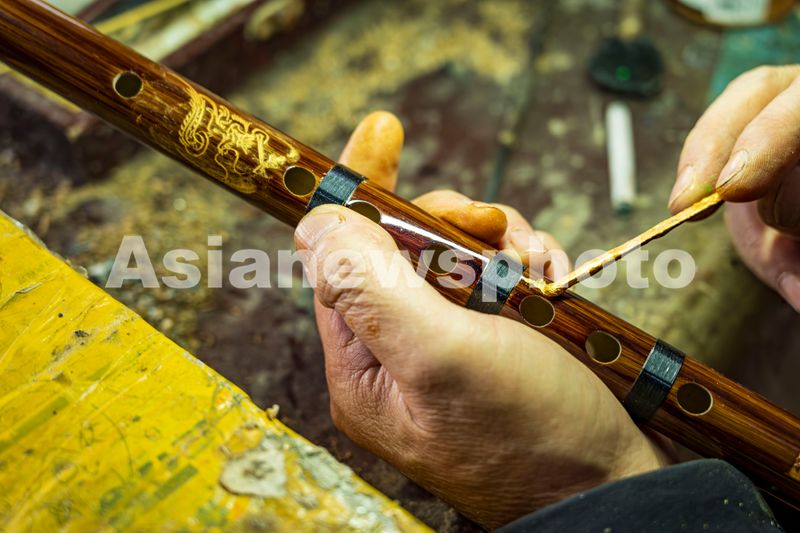 图片说明:2025年1月2日,贵州省铜仁市玉屏侗族自治县,玉屏箫笛制作技艺传承人吴继红师傅在制作的笛子上涂抹金粉。