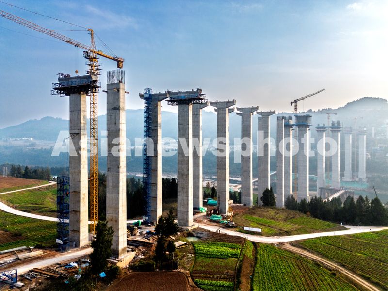 2025年1月2日,四川省巴中市通江县境内,镇广高速广纳通江河特大桥项目正在加快建设。