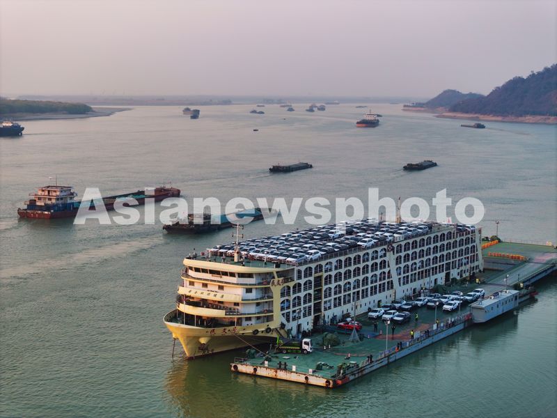 图片说明:2025年1月2日,夕阳西下,安徽港口集团芜湖港朱家桥港区,一艘滚装货轮正在装载出口海外的奇瑞汽车。(无人机照片)