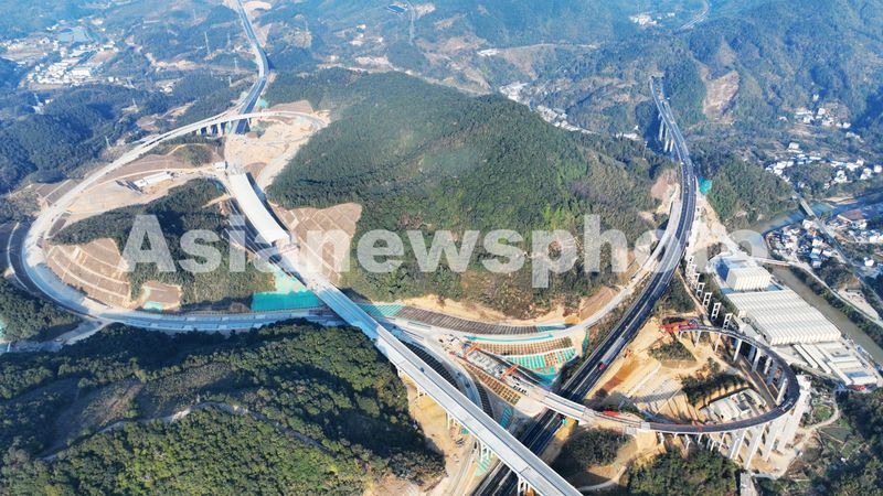 2025年1月2日,江西省十四五重点工程遂川至大余高速公路(简称遂大高速)崇义枢纽互通施工现场,工人正在加班加点架箱梁施工作业。