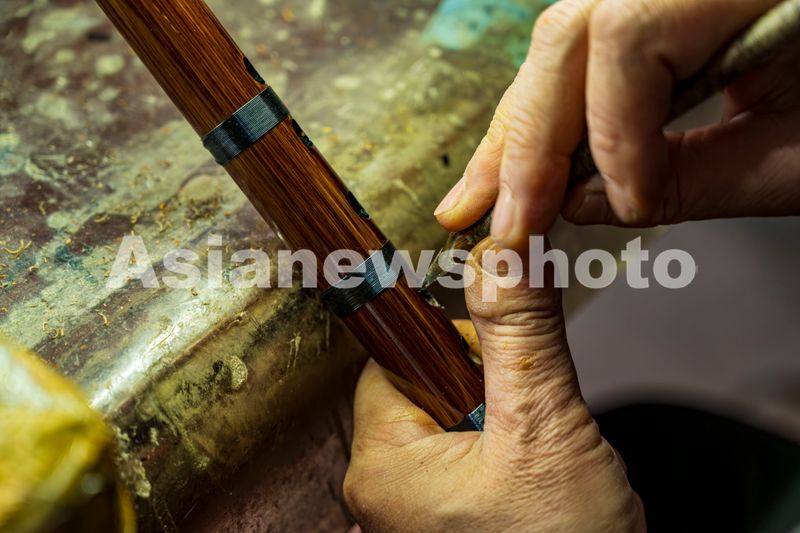 图片说明:2025年1月2日,贵州省铜仁市玉屏侗族自治县,玉屏箫笛制作技艺传承人吴继红师傅生产车间工作台为打好音孔的笛子修音眼。
