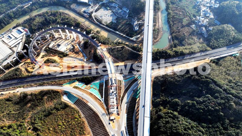 2025年1月2日,江西省十四五重点工程遂川至大余高速公路(简称遂大高速)崇义枢纽互通施工现场,工人正在加班加点架箱梁施工作业。