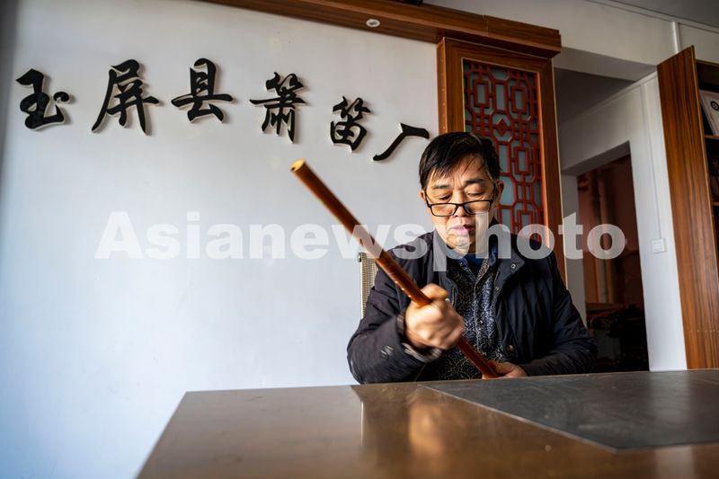 图片说明:2025年1月2日,贵州省铜仁市玉屏侗族自治县,玉屏箫笛制作技艺传承人吴继红师傅在对制作的箫进行外观打磨。