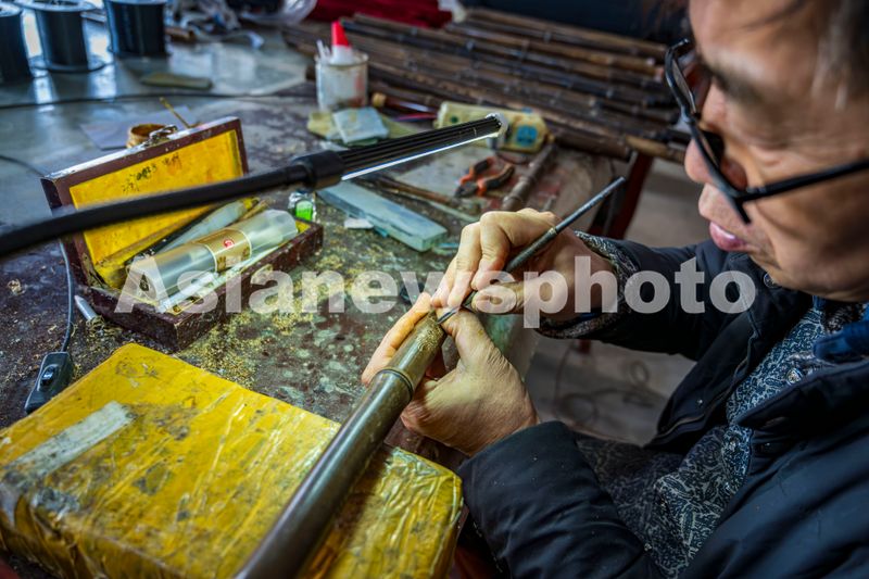 图片说明:2025年1月2日,贵州省铜仁市玉屏侗族自治县,玉屏箫笛制作技艺传承人吴继红师傅在制作的箫上雕刻花纹。