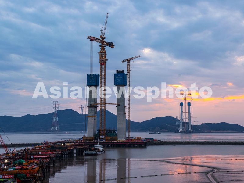 浙江舟山:双屿门特大桥索塔建设双双超百米 查看组图