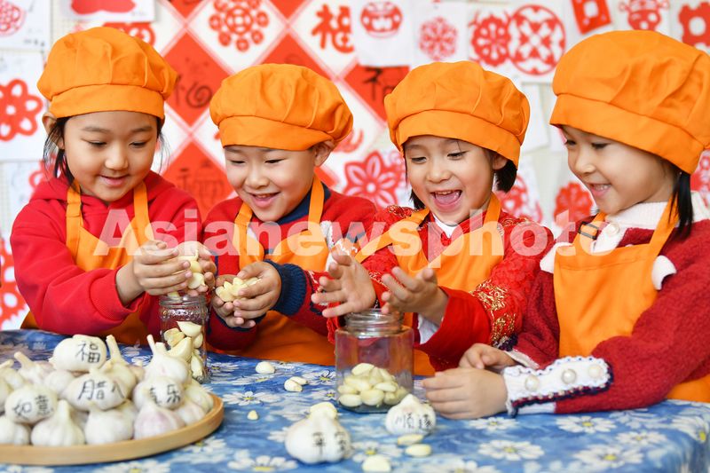2025年1月6日,山东省烟台市福山区实验幼儿园的小朋友在体验制作腊八蒜。