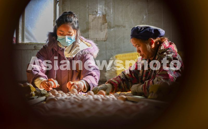 2025年1月6日,贵州省铜仁市玉屏侗族自治县平溪街道安坪村村民在蛋鸡养殖场采收鸡蛋。